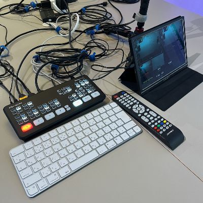 東京校は教室とZOOM、そしてZOOMで録画したビデオのストリーミングの三つの受講ができる体制になっています。写真は机上に配線が行き交っているZOOMとビデオとスイッチャ類です。簡単な装置ですが、手元カメラやパソコンの出力など切り替えて、解りやすい記録になるよう随時切り替えています。